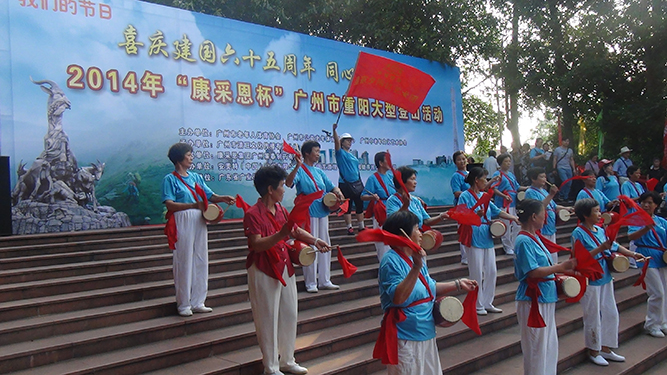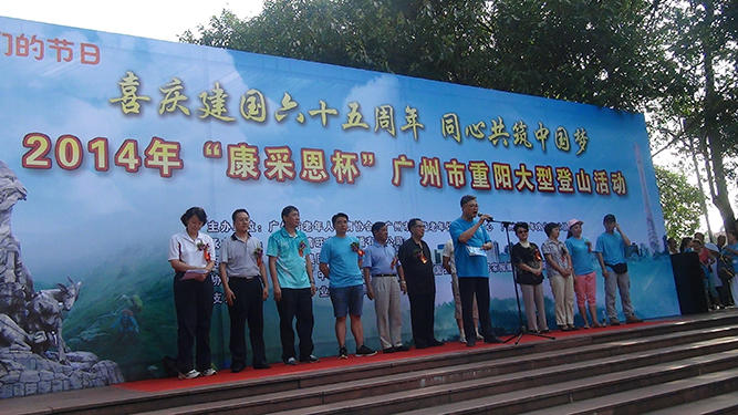 经过一个多月的经常筹备,2014年广州市九九重阳万人登山活动盛大举行,这次主办单位是:广州市老年人体育协会、广州市公益老年体育发展中心、广州中老年文化艺术协会。承办单位是:广州市清旺文化传播有限公司。冠名单位:康采恩集团广州萊泰制药有限公司。