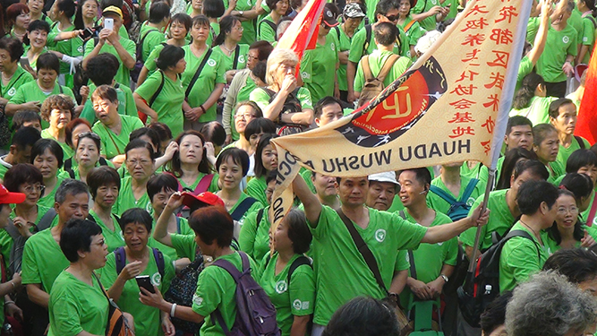 2015年广州九九重阳万人登山活动在白云山广场前盛大开始。每队都打着旗帜,都穿着由广州中老年文化艺术协会发的统一绿色短袖衬衣,整整齐齐大型队伍向山里进军。登山让人放松,消除身体的紧张状况,让自己舒展打开。人人笑得锦如花,列队争相见。初上山时底下天气热的毒人,脸上都是火辣辣的,但每个人就像火热天一样的热情,如长着翅膀往山上登。一路走来,太阳光专往人们脸上、身上钻,汗水流下一道道曲线,像控制不了的小河流着流着,身上的劲头也用尽了,不知什么时候在火中的太阳来了一股小微风给人们带来了精神,给人们带来了希望,给人们带来了坚持到底的信心,直到中午12点才陆陆续续带着健康下山了。