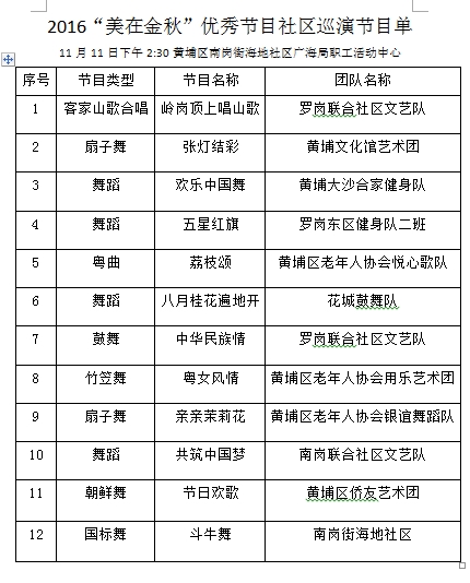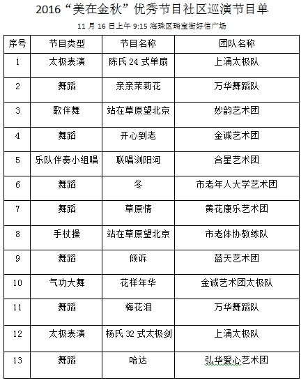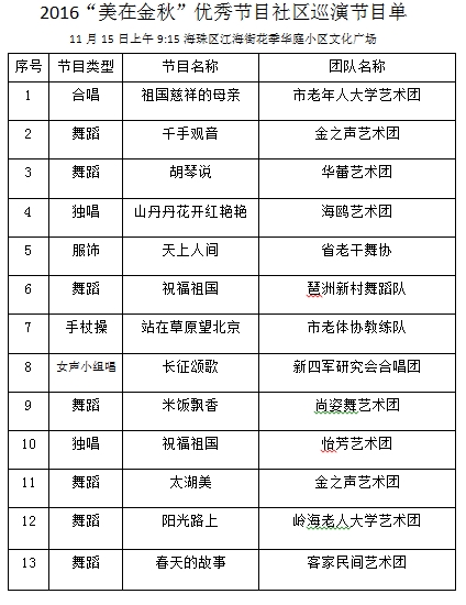 此次社区巡演是广州市老龄办继隆重举行2016年“敬老月”文艺汇演之后组织举办的老年文艺盛事,旨在通过将优秀老年文艺节目走进社区,全面展示我市老年人积极向上、与时俱进的精神风貌,丰富老年人的精神文化生活,进一步营造敬老爱老浓厚社会氛围。在接下来的整个11月份,社区巡演将分别走进海珠区江海街花季华庭小区文化广场、海珠区瑞宝街好信广场、天河区珠吉街珠村七夕文化广场及黄埔区南岗街海地社区广海局职工活动中心等地,持续举办社区巡演活动,让更多的老年朋友足不出社区就能享受到老年文化盛宴,同时也向社区传递尊老敬老的正能量。