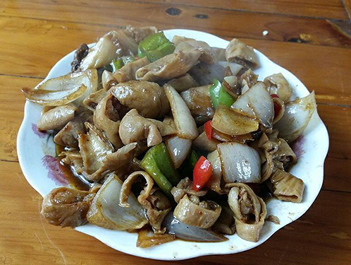 第五种,爆炒肥肠。做这道菜的时候也需要点技术,处理不好的话确实非常臭,当然了,喜欢吃肥肠的人能吃一盘,不喜欢的人闻到那个味道就想吐。