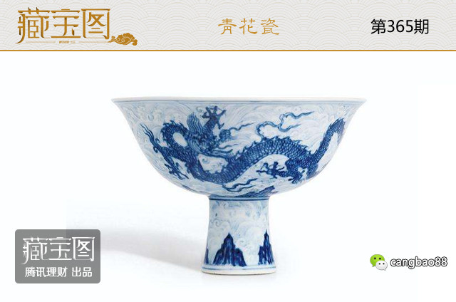 【明宣德 青花暗花“海水游龙图”高足杯】高8.7厘米、直径9.8厘米。外壁绘火焰海水及一对盘龙戏珠、足柄绘海水江崖、留白作为浪花。口沿内外及足沿绘青花双圈纹饰,外罩亮青透明釉、釉层肥厚、白中发青。青花绘双龙纹样为典型永宣风格,暗花以青花浅绘海水纹样、动感十足,杯心书大明宣德年制六字楷书款。在2012年香港苏富比春季拍卖会上拍出9159.258万元。