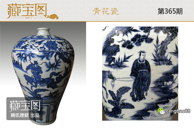 【萧何月下追韩信元青花梅瓶】该瓶通体绘有青花纹饰,肩部绘杂宝及缠枝牡丹花纹、牡丹可谓花中之魁、象征“雍容华贵、大气超凡”。青花用料浓淡相宜、发色明丽、富有层次感,绘有象征“身份尊贵、帝王之气”宝莲纹,堪称元末明初青花瓷中的绝品佳作。而这样的青花梅瓶全世界只有三件:一件收藏于江苏省南京市博物馆,系该馆的“镇馆之宝”号称十亿元不卖;一件仍在海外下落不明;另一件出现在2011年澳门中信秋拍上,该“元青花萧何月下追韩信梅瓶”,以6.85亿元人民币的高价成交。