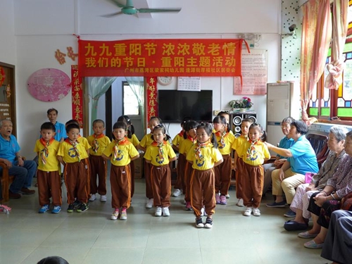 重阳节下午,广州市荔湾区能享敬老院的房间里传出银铃般清脆的童声,原来是荔湾区逢源街厚福社区居委会联合梁家祠幼儿园带着四十名小朋友们给敬老院的爷爷奶奶送祝福来。随后义工们又给社区三无孤老走访慰问送上精心准备的慰问品和节日的祝福。义工们用手推车拉着物资,一家一户将温暖送到每一个长者的家中。