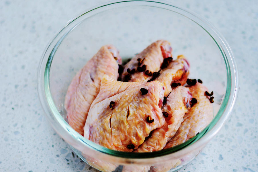 鸡翅洗净擦干水在鸡翅上划几刀口子,洒上精盐、花椒、倒进少许料酒。