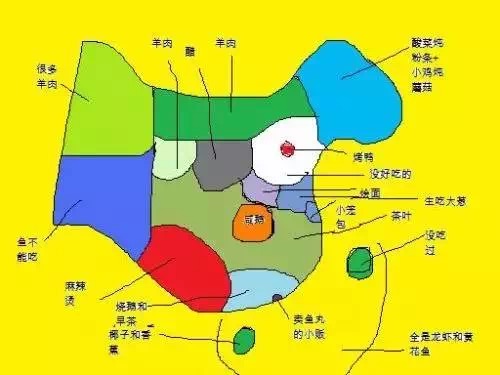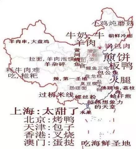 当然了,这幅充满作者个人倾向的“原始”吃货地图也在广大网友中引起热议。有人说:“上海太甜,那苏州和无锡人民咋办? 不准!吃海鲜的圣地是环渤海一带,冷水的海鲜好吃,我爸说南方的海鲜没青岛大连的鲜!”自此之后,全国网友脑洞大开,出现了各种千奇百怪的“升级版”天朝美食地图。