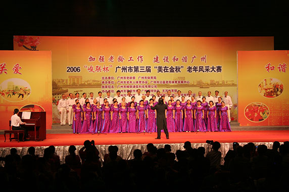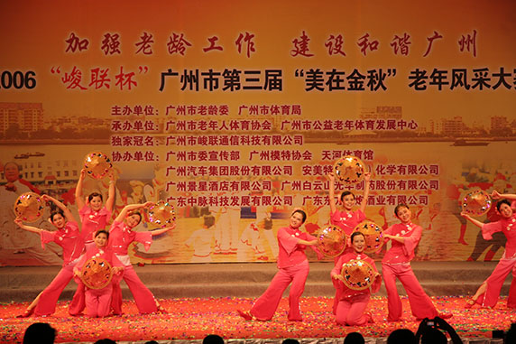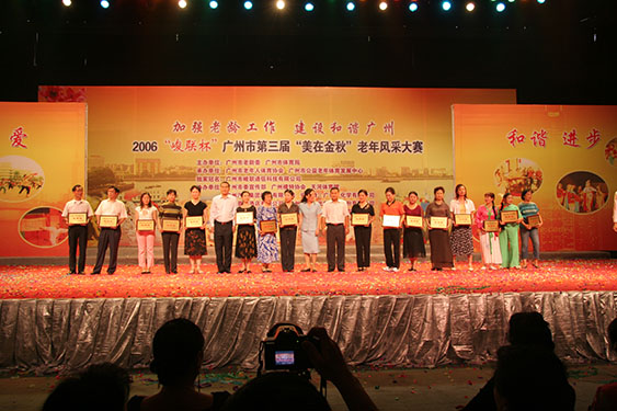 在2006年8月1日由广州市老龄委,广州市体育局,广州市体育协会,广州市公益老年体育中心举办的第三届“美在金秋”老年风采大赛历时三个月终于圆满结束 ,这次表有舞蹈、乐器、小品、独唱、模特秀等。